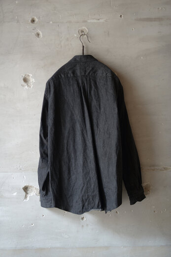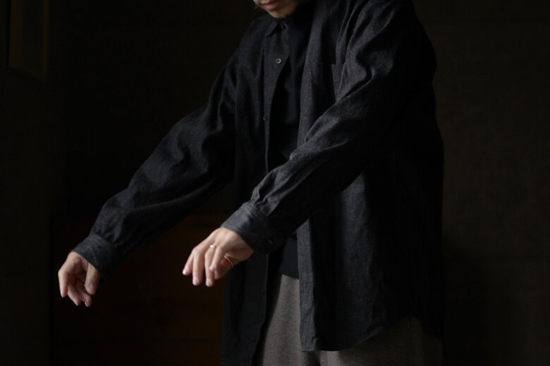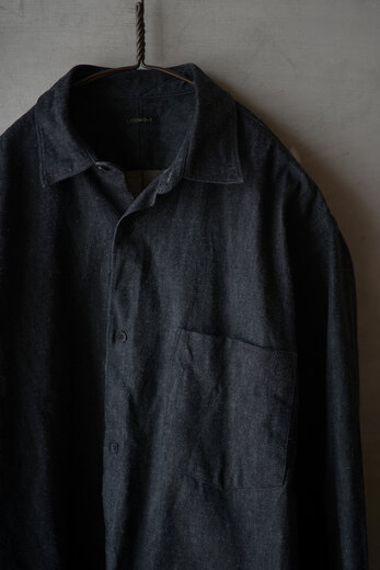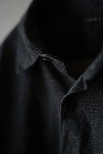 コモリのデニムシャツほど数年後に様変わりしているものはないと思う。なぜならシャツ自体のデザインがとてもミニマムだからだ。ステッチも同色でボタンも黒。着て洗う・・を繰り返す度にステッチやボタンとのコントラストが生まれる。それは人それぞれ変化が異なり、長く着た人にしか味わえない楽しさがあるシャツなのだ。今回は色落ちが楽しみな黒と生成りの糸を使ったデニム。デニム好きのお客様が『シワやパッカリングの入り方を見ると、とても考えられたデニムシャツですね。』と仰られていました。