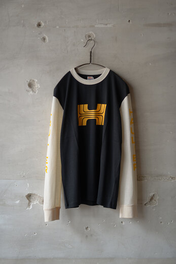 今年の春はスポーツ系(モーターサイクル)のカットソーにクラシックなものを羽織りたいと思って、古着屋さんを回ってみました。色々なデザインや独特な配色、ロゴ、格好良い物が沢山ありました。でもめちゃくちゃ小さい。そりゃ競技中に着るものだからか・・と後から気付きました。そして素材は化繊が多く、決して着心地はよくなさそうだったので結局断念しました。そんなアンテナを張っていたからか、見つけたのがオーストラリアのHAULIERでした。古いレーシング用からインスピレーションを受けたデザイン、ロゴと配色(黄色!)、サイズと完璧でした。そして何よりこの見た目で上質なマーセライズドコットンのメッシュという所が決め手となりました。着心地も良くて気分も上がります。