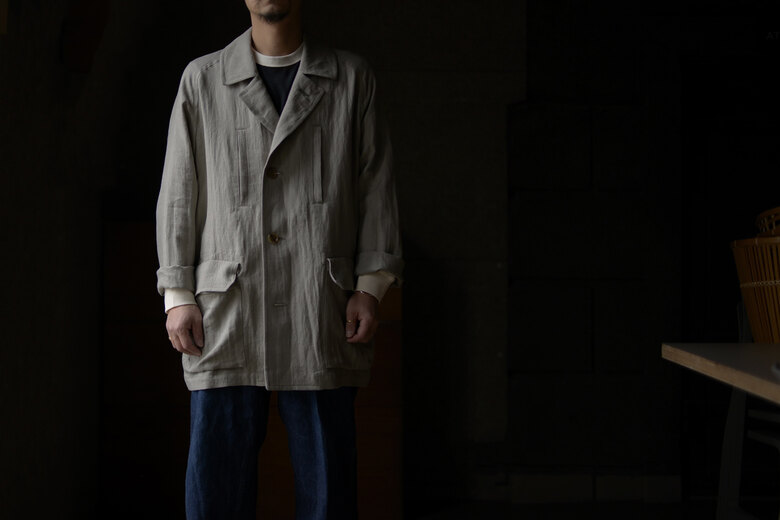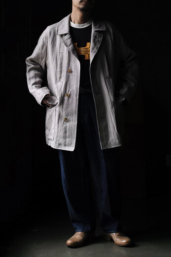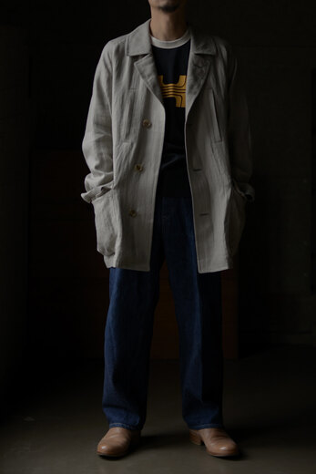 この洋服が目当てだった訳ではないのですが、ふと視界に入った生地。気が付くと引き寄せられるように触っていた。あきらかに良い生地。そして好みのリネン。あのプルプルっとした感じ。今後入荷してくるアレやコレやと組み合わせがすぐに頭に浮かんだ。聞くとヴィンテージを再構築して物作りをしているブランドだそう。作りや着心地も素晴らしく、このリネンとF-2の組み合わせが気に入って仕入れる事にしました。シャツでキッチリ着るのもありだし、Tシャツの上に羽織るのも良い。真夏にはノースリーヴの上にガバッと。着込んで着込んで雰囲気を出していきたいジャケット。