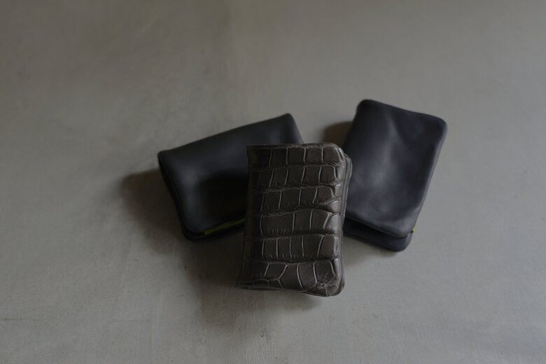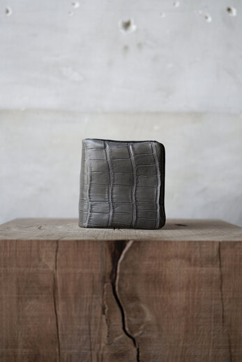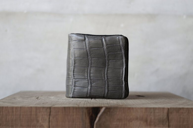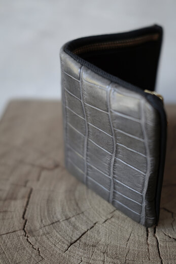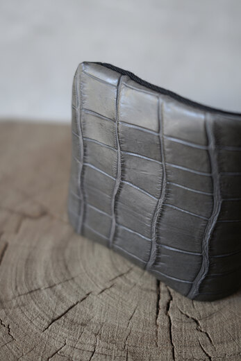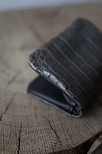 削ぎ落としたデザインやシンプルな使い方が魅力の内縫い折財布。ジップは内側、折り畳んだ状態だとステッチすら見えないミニマムなお財布。ジップを開いてお札を入れて、カードを突っ込んで、小銭を入れるだけ。(小銭を入れるとコインの跡が革に残るので、別にコインケースを持つのも良いです。)革はクロコダイルの中でも最高峰のポロサスクロコ。しっとりしていてとても品のある表情だ。そんなクロコの質感を最大限活かすために芯材を一切使わず、一枚仕立てで作られている。さらに内縫いでステッチが表に出ない作りなので触り心地が良い。気が付くといつも触ってしまう程。使い始めはふっくらしているが、使い込むと写真の様に収まりが良くなる。そして艶が増し、経年変化を存分に楽しめるのだ。内側にはGuidiのカーフ、贅沢でこれ以上ない組み合わせではないだろうか。内縫いカードコインケースと一緒に使うのが今の所、最適解。