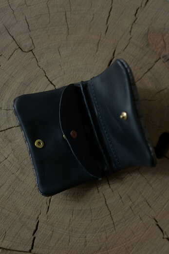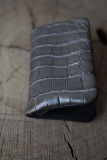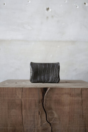 カードケースサイズの小さなお財布。小銭も入りカードは無理なく10枚位は入る。頻繁に使うクレジットカードや定期などを入れておくと便利。お札は三つ折りにして最低限必要な分だけ入れておく。最近はクレジットカードやスマホで殆ど買い物が出来てしまうので、メインの財布は鞄に入れておいて、この財布を常にポケットに入れておく。個人的にもそんな使い方をしているが、あまりにも使い勝手が良いので随分と長い間これで落ち着いている。革はクロコダイルの中でも最高峰のポロサスクロコ。しっとりしていてとても品のある表情だ。そんなクロコの質感を最大限活かすために芯材を一切使わず、一枚仕立てで作られている。さらに内縫いでステッチが表に出ない作りなので触り心地が良い。気が付くといつも触ってしまう程。使い始めはふっくらしているが、使い込むと写真の様に収まりが良くなる。そして艶が増し、経年変化を存分に楽しめるのだ。内側にはGudiのカーフ、贅沢でこれ以上ない組み合わせではないだろうか。