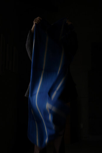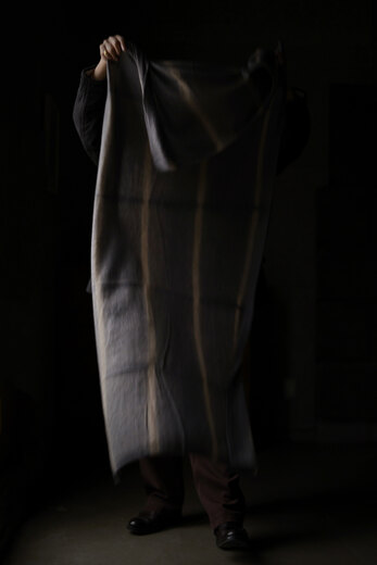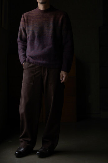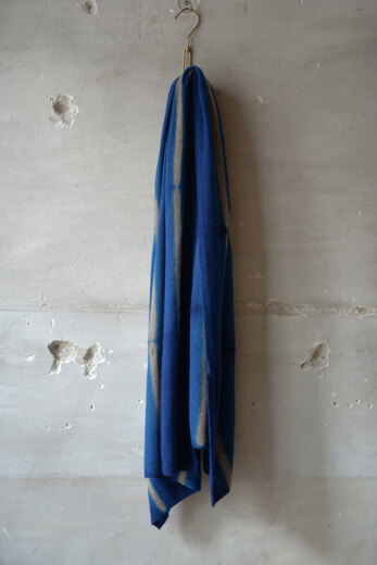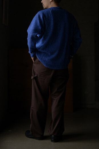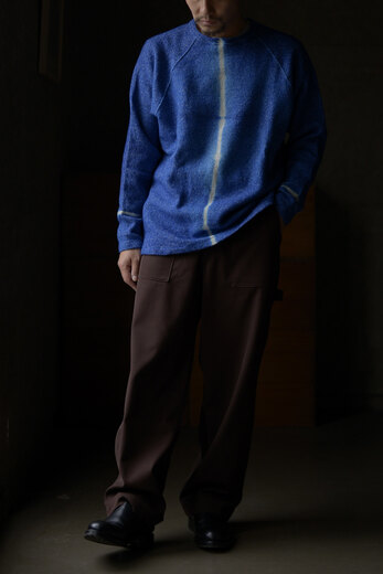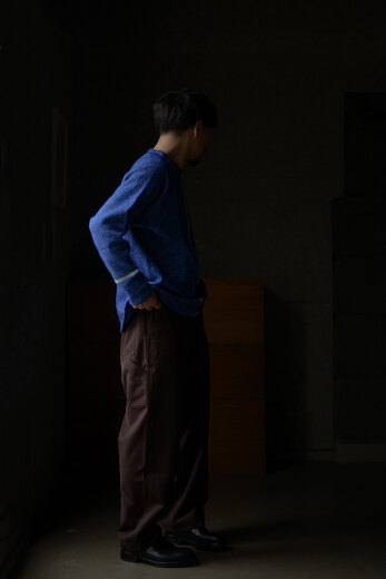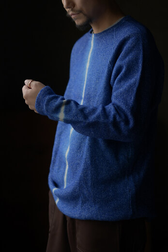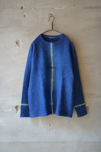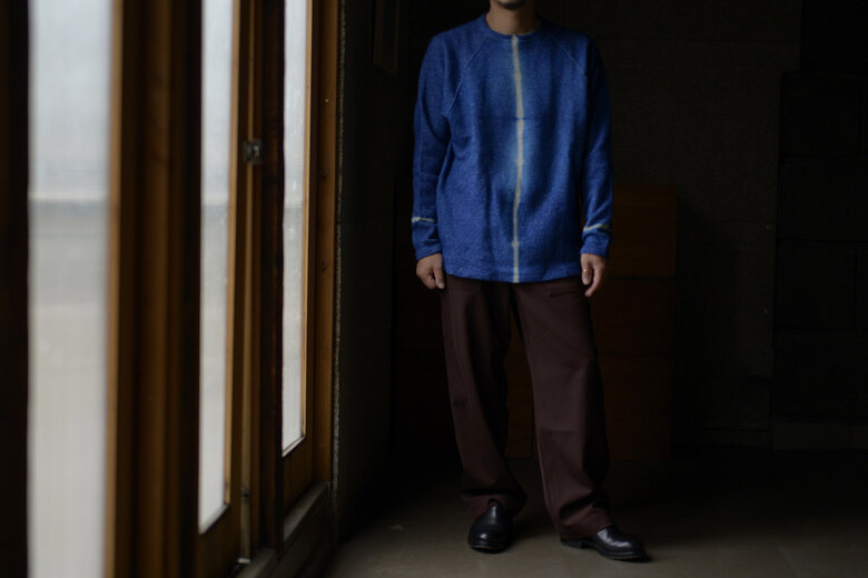 出来るだけ肌に近い洋服は天然素材の物を選ぶようにしている。自分の皮膚にも優しく、汗をかいても蒸れる事はなく、ちゃんと呼吸をしている気がするからだ。スウェットのようなニットのような、ウールコットンのジャージー。分厚すぎず、薄くもなく、インナーにも使いやすいバランス。しっかりしているけど動き易さもあって暖かい。染色は潔いラインの棒締め絞り。所々滲んだブルーのグラデーションが印象的で、ジャケットやコートから覗くブルーを想像しながら選んだ1枚。