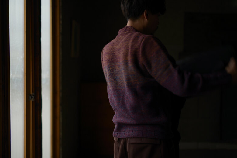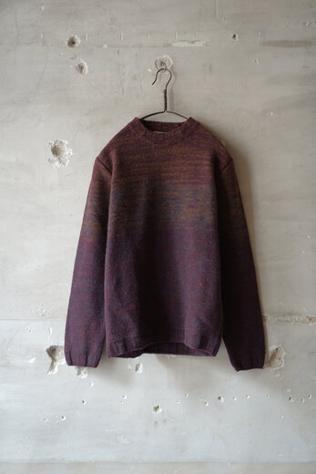 僕にとって冬のニットにはイニシュマンが欠かせない。どこまでもクラシックな空気とイニシュマン島の自然から着想を得られて作られる色や見た目からは想像出来ない質の良い糸と作り。そんな所に魅力を感じお店に並べている。素肌に着たくなる肌触り、詰まりに詰まったウールカシミアは保温性が非常に高く、タフで何年着てもへこたれず、ちゃんとメンテナンスをすれば何十年と共に歩んでいけるセーターだ。暖色系のグラデーションは島の夕日からイメージしたそうで、合わせ易く、どこか安心できる配色。ニットの暖かさと心地良さを体感できるセーター。