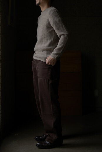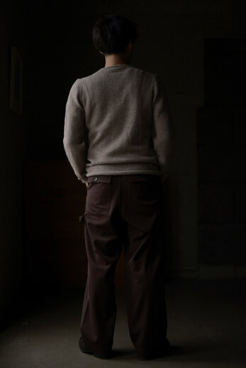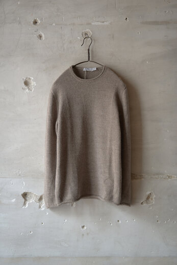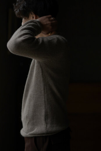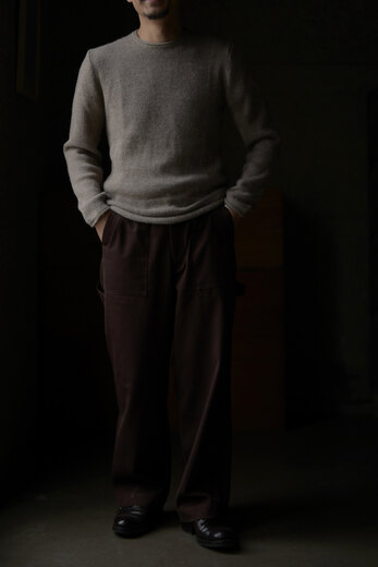 初めてイニシュマンの素材を触った時に驚いたのがベビーアルパカ。持つととろけてしまうような柔らかさ。一瞬にして虜になってしまった素材だ。希少なベビーアルパカを100%使ったセーター。少しタイトなフィッティングで体に沿い、より心地よさを実感できる。インナーとしてジャケットやコートの下に着てもストレスになる事はない。めちゃくちゃ暖かくて、Tシャツのように着れるセーター。この素材をぜひ体感してみてください。