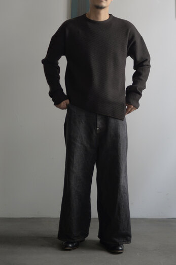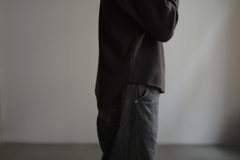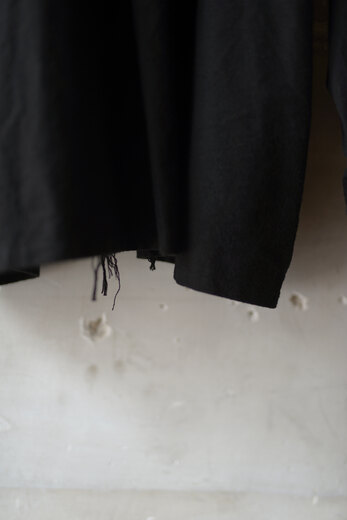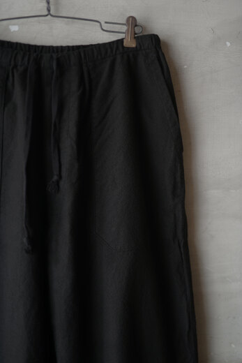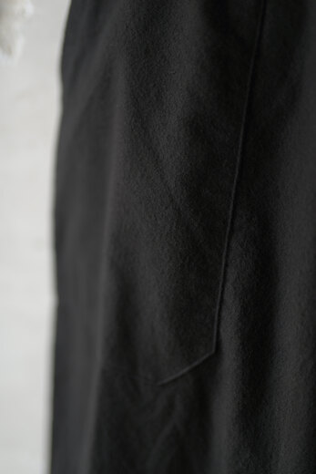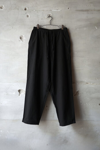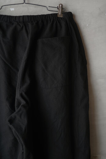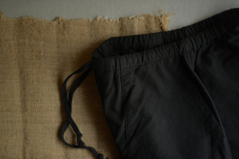 この黒と素材を見た時に夜の街に溶け込むイメージが湧きました。シャツジャケットと合わせて着るとそれはなんとも快適で飲みに行く時にも良いなと思いました。主張するわけではなく、どちらかというと目立たず風景として溶け込む。よりその場面を楽しめるような気がしました。コットンネルは柔らかく少し乾いた雰囲気。ウエストはゴムと紐なので、フリーです。テーパードしたシルエットはゆとりがありながら野暮ったさがありません。