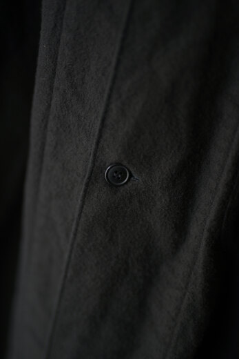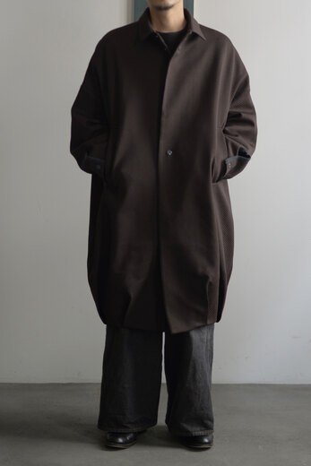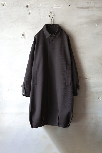 たっぷりと贅沢な生地使いで丸みを帯びたコクーンシルエット。とても可動域が広くて動き易いのですが、体が入ると不思議と収まりがよく見えるコートです。今回はポリウレタンのジャガード織。凹凸による陰影とデザインの違和感が心地よく、素材がコートを引き立てているように感じます。