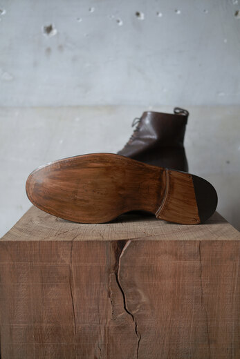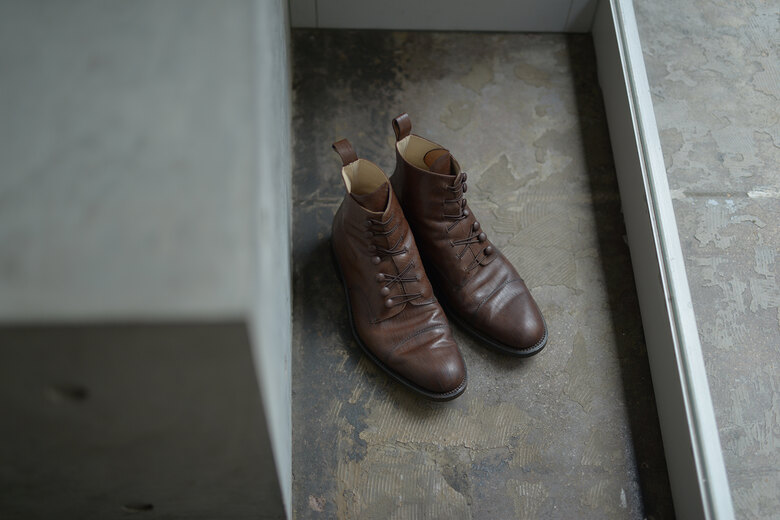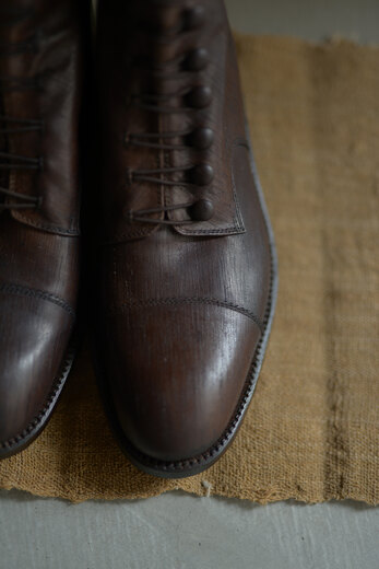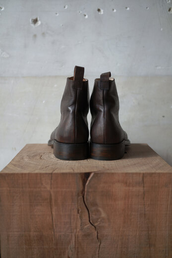 前回のボタンシューズと同じマリヤムのホースレザー。履かれている方達はみなさん揃って”履き心地が良い”と言われています。なので僕自身も色違いを試してみたくなり、ダークブラウンを使ってみる事にしました。今年の冬パンツに合うブーツをイメージしていました。そのみつを訪ねると新型のボタンブーツがあり、革の表情とデザインの相性が良さそうだと思いました。足を入れて普通なら紐を結びますが、ボタンにゴムを引っ掛けていきます。慣れるととても簡単に着脱ができます。ゴムは強力で足首までしっかりと固定される為、足と靴が一体となり、一歩一歩踏み出し易いです。靴を履く時の少し異なる動作。その少しの変化が同じ時間に新鮮さを与えてくれるような感覚になりました。
