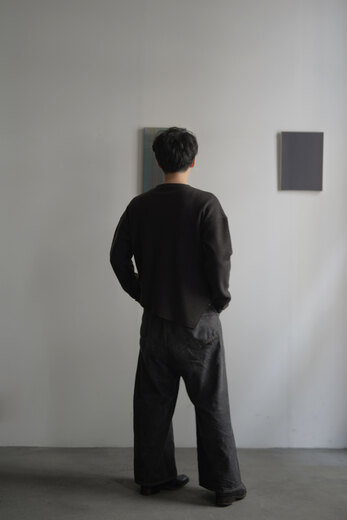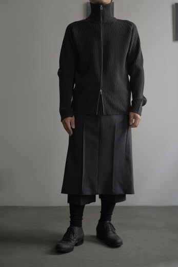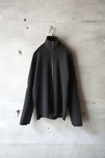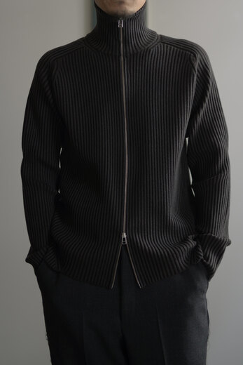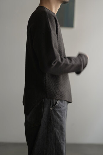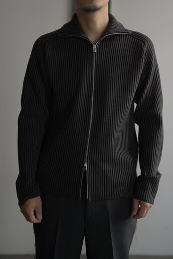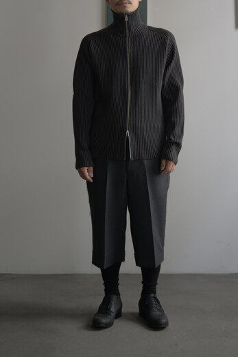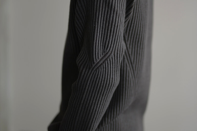 ドライバーズニットというクラシックな要素とSF的でユーモアを感じると同時に、自然な柔らかさも感じる。そんな考えが右へ左へと行ったり来たりする中で、ふと我に返り、「あ、これはOMAR AFRIDIだ」と感心する。無機質で幾何学的な要素を備えながらも、生地からは柔らかく有機的な雰囲気が漂う。例えば、無機質で機能的な要素を持つ力強い服はあるし柔らかくて心地よさを持った生地を使った優しい服もある。しかし、このニットはそのどちらかに偏ることなく、両方を絶妙なバランスで併せ持っている。どちらかに思い込んで試着すると裏切りに近い感情を受ける。その異なる要素が、同じ空間に自然と収まっているのだ。そんなドライバーズニットは新しくてやっぱりSF的でユーモアがある。