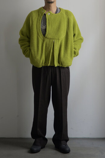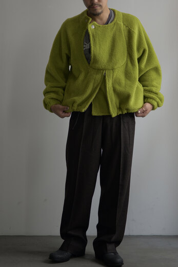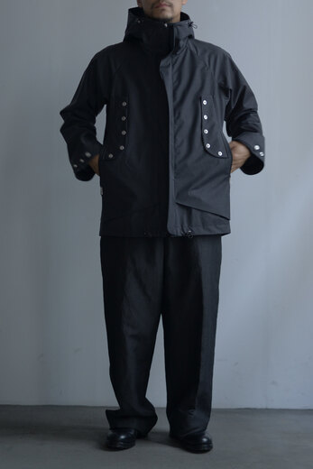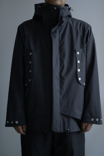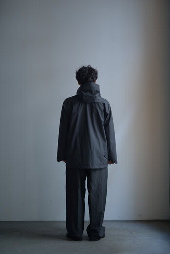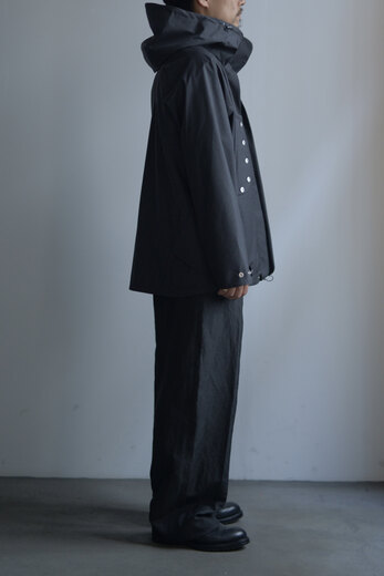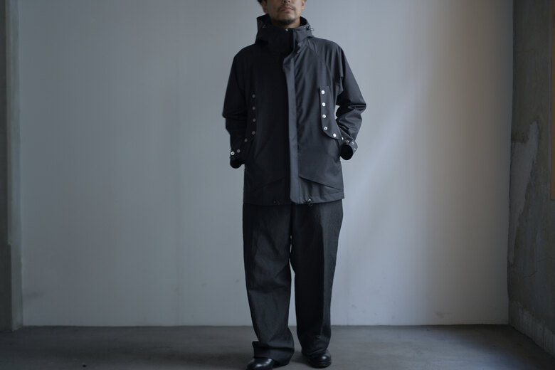 イタリアはロロ・ピアーナ社のCLIMA SYSTEMという熱の伝導率が非常に高く自身の体温によって均一に温まる生地。さらに風や雨を通さず、透湿性にも優れている。だから薄くても暖かくとても軽い着心地だ。ニュージーランド産ウールのクラシックな生地にアウトドアの要素が加わり不思議なバランスが新鮮に感じるジャケット。丈が短い分、ワイドパンツとも相性が良く合わせ易い。動き易いので自転車や車に乗る時にも。パッと着れてパッと脱げる。気楽な使い方が出来るけど洗練されている。そんなありそうで無かった所が気に入りました。
