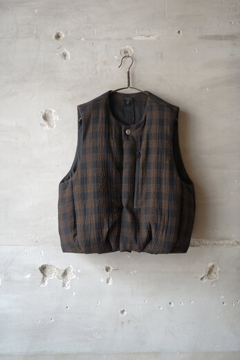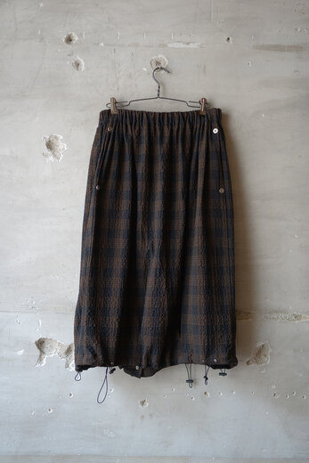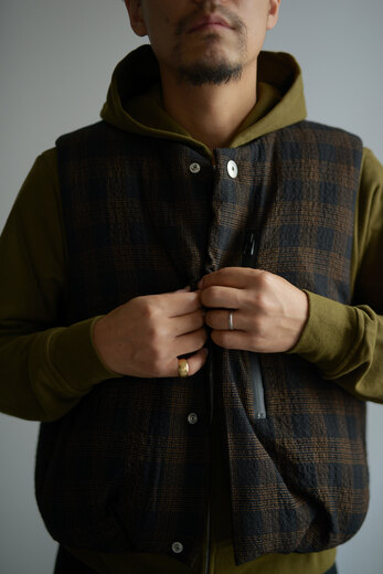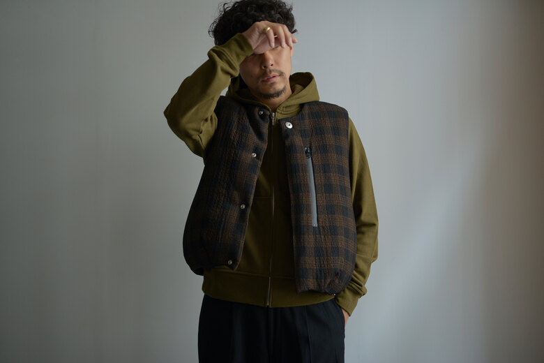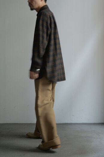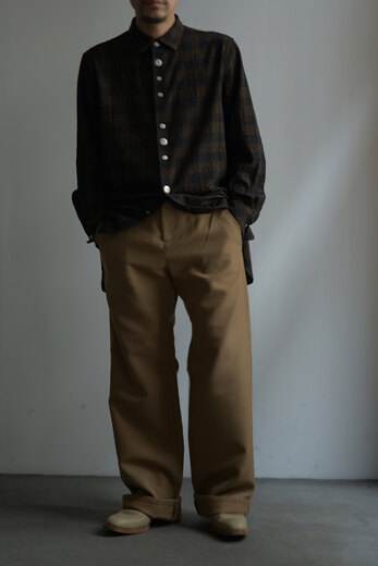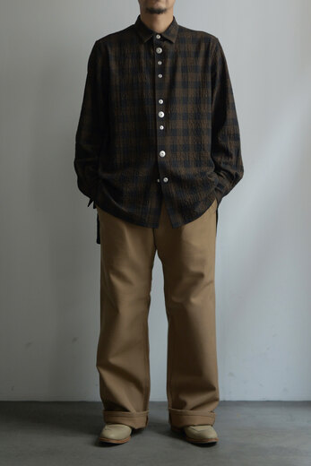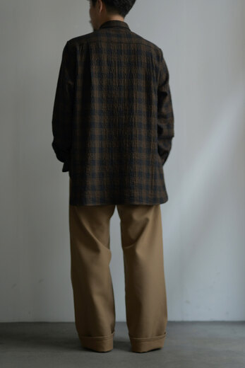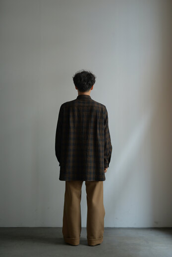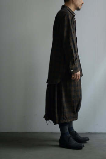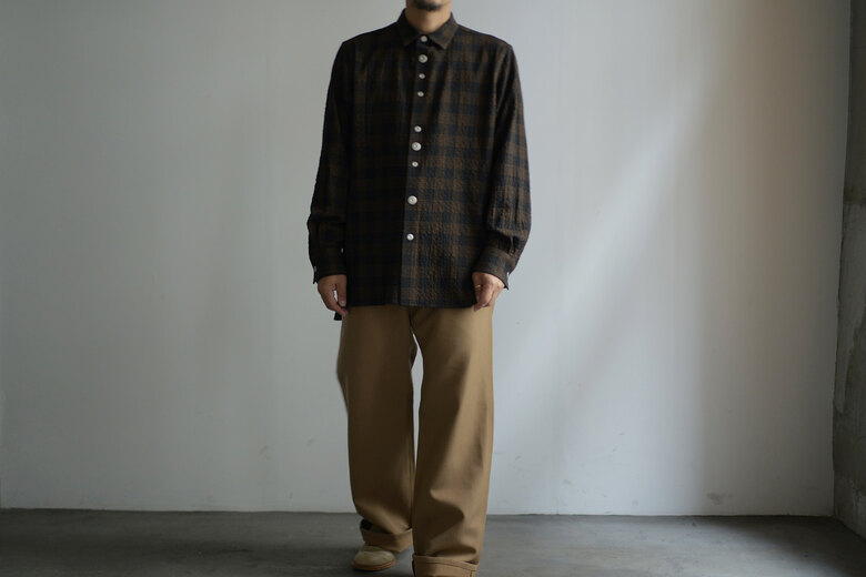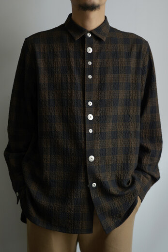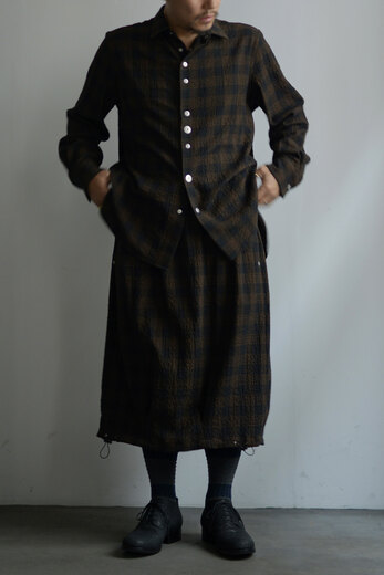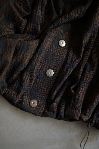 リズムよく並んだスナップボタン。開閉はスムーズで感触や音が良い。クラシックなテキスタイルにそんなボタンを使った違和感が面白いと思ったシャツ。ウールとポリエステルとナイロンが合わさったブラウンのチェックと凹凸のある素材が秋を連想させる。素材自体がとても気に入ったので、シャツとベスト、スカートを選びました。少しブラウン味のあるトラウザーズ、色の落ちたデニム、ちょっと綺麗なスラックス。色々合わせるのが楽しそう。1枚だけでも主役になれるOmar AfridiのA SHIRT。