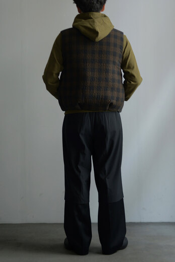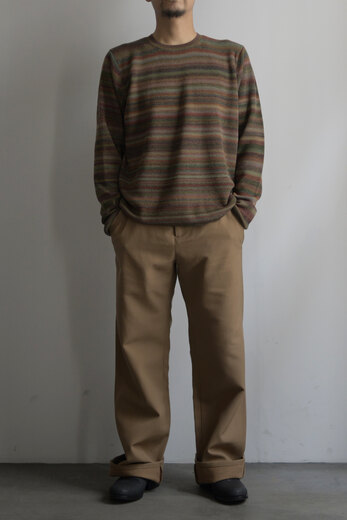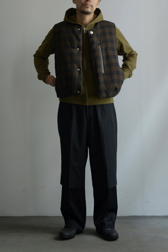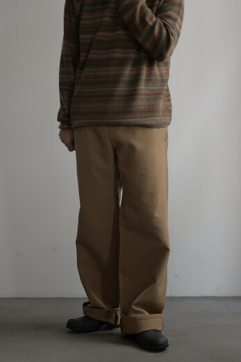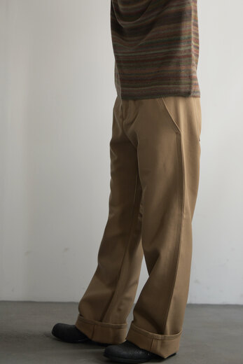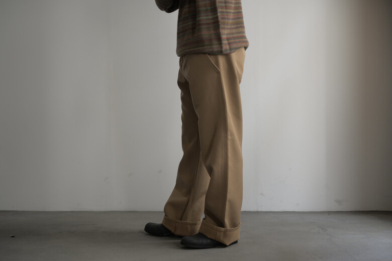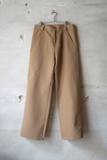 ワークウェアワークパンツから着想を得て作られた新型のVÁGAR PANTS。seya.らしい優しい素材や色、着心地の良い仕立て。ワークウェアの様に気兼ねなく穿けるけど、ストレスを感じない穿き心地が快適。コットンとウールを甘く織った生地は膨らみとハリがあり、シワになりにくい特徴のある生地だ。そして程良い重みがあり美しいドレープが生まれる。さりげない3本ステッチでの縫製や大きめなバックポケット、ワークウェアだけど上品な雰囲気のあるパンツです。