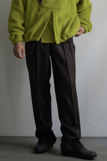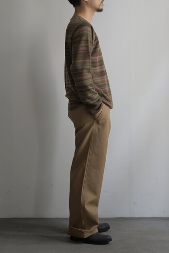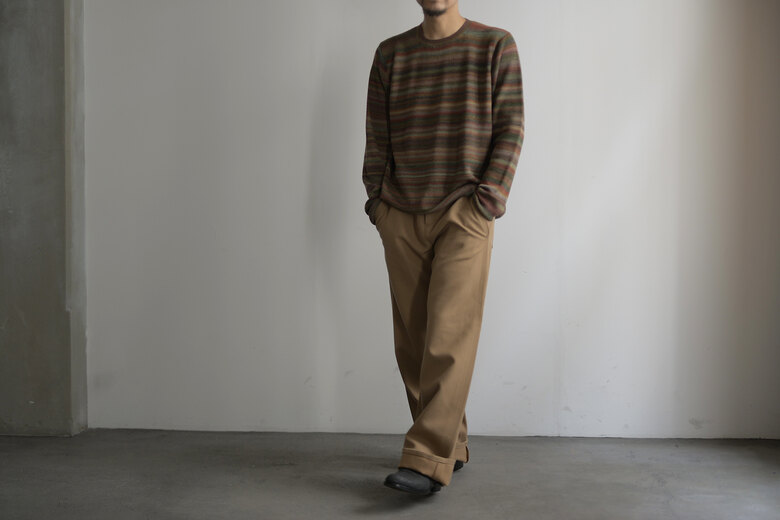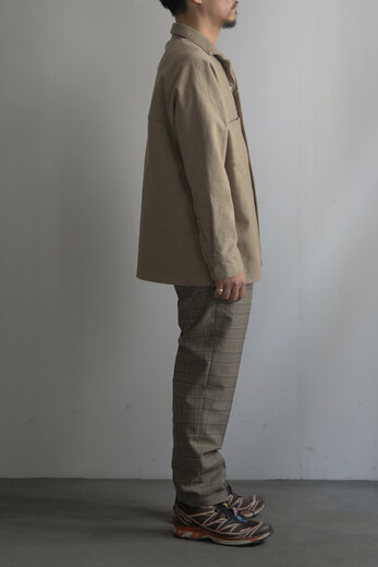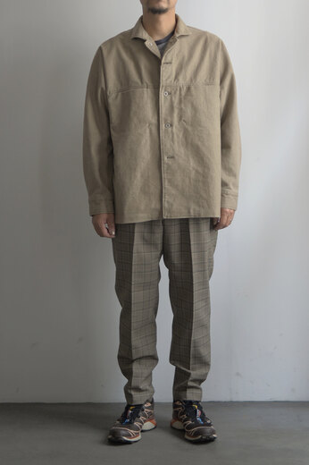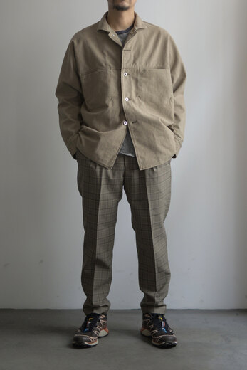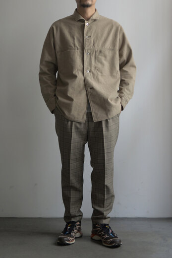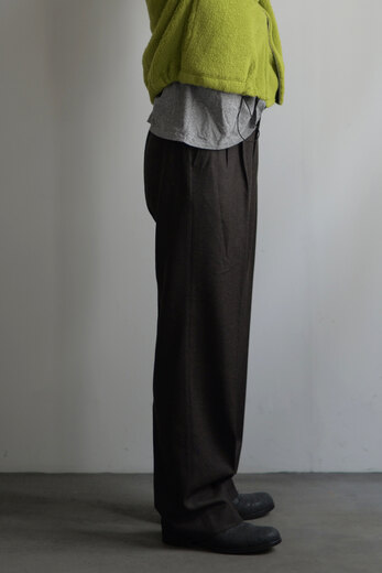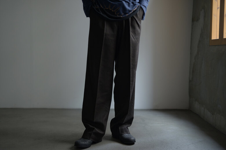 TRAVEL PANTSならどこへ穿いて行っても大丈夫。きっちりしたい時はきっちり見えて、崩したい時にはラフになり過ぎない。持っていると安心できる様な、seya.の定番のトラウザーズ。今回の生地は柔らかく、コシのあるツイード。ほぼ無地にしか見えない色に細かいツイードで起伏を与え、独特な雰囲気に。経糸には微光沢のあるレーヨン糸にウールを巻き付けて織り上げているそうで、優しい光沢が丁度良い。そのみつやPETROSOLAUM、AFOUR。どの靴を合わせてもしっくりくる、ある意味万能過ぎるトラウザーズ。