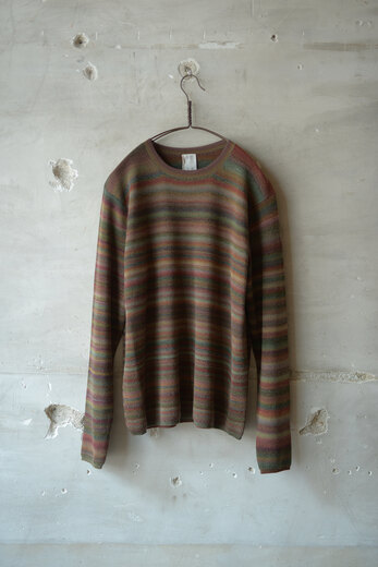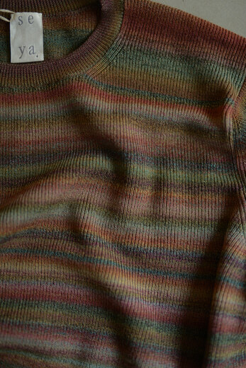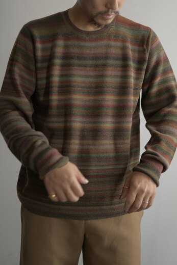 グラデーションに染めたウール糸で作られたニットはフェロー島の自然をイメージしたそうです。30色もの色を異なるピッチで染めているらしく、編んでいくと色彩がランダムに交わり、とても幻想的で美しい色合いに。エクストラファインメリノウールに防縮加工をし、手洗いも可能なウォッシャブルウール。しっかりしていて少しシャリッと。肌あたりも良くチクチクもない。視界に入った途端、目が離せなくなったグラデーション。沢山の色が使われているので、様々な色の洋服との組み合わせを楽しんでください。
