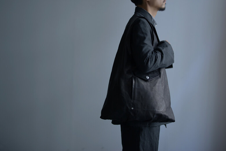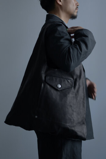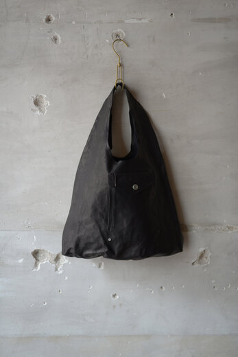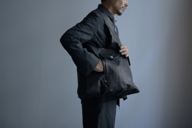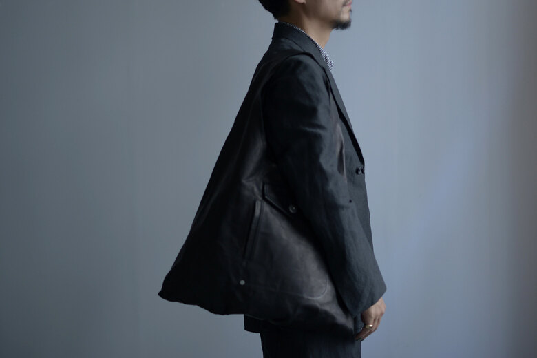 ベスト?洋服みたいな体と一体化したようなバッグ。生地はカーフレザーを使用しとても柔らかく体に沿い持ち手は1本で肩に掛ける事を想定されたデザイン。幅は広いので肩にかけた時はとても楽で負担がない。スッと出し入れできるポケットとボタンがついたポケットが外側に2ヶ所ついているのだが、シルバーのボタンがアクセントになっている。新しくセレクトしたlea bobergの少し肩の力を抜いたセットアップなんかを着た時に引き締めてくれる感じがすごく相性がよく気に入っている。それに、メガネとかアクセサリーのようにその人の顔となるアイテムが存在するが、このレザーバッグもそんな顔のような存在になるんじゃないかなと、誰の新たな顔となるのか楽しみしています。