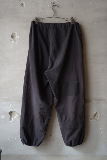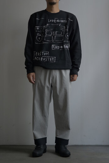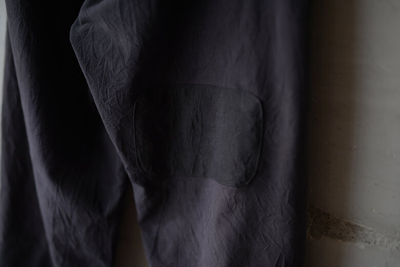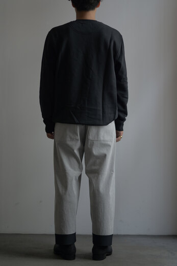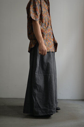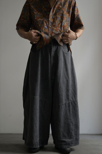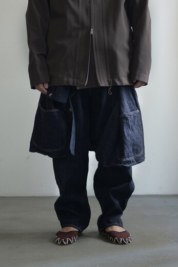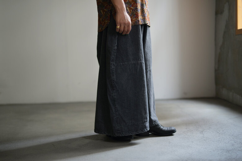 持った瞬間、ほとんどの方が『重い!』と言われる。パンツ2本以上の生地を使っていそうなとてもとても太いズドンと落ちるパンツ。穿いてみるとその重さが心地よく、体の重心が安定する様な気がする。見た目はまるで袴の様でもあり、スカートの様でもある。初めての体験なので何を合わせるか未知数ではあるけれど、この際なんでも良いんじゃないか、好きな物を組み合わせて楽しんでしまおう!と思える洋服。体が入ると余った生地が前へ後ろへ折り畳まり、歩く度に生地が動く。デニムでこの動きが出るのはすごく面白いと思った。
