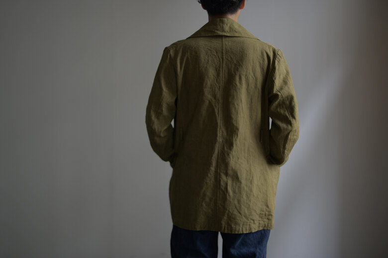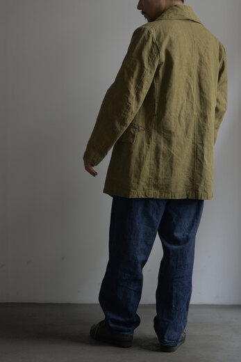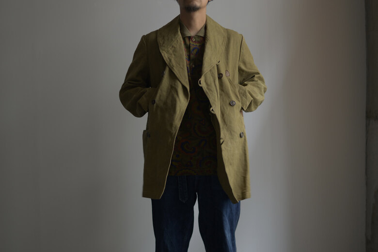袖を通すと仕立てと生地の良さにゾクゾクする。ごく稀にそんな洋服に出会うことがある・・・。ラペルにはムートンボアが付いておらず、さらにはリネンキャンバス素材という大変珍しい個体でもある1940年代フランスのカナディアンジャケット。当時の富裕層向けのウェアとしてテーラーによる仕立てと推測される立体的なカットは現代ではとても上品。そして再現が難しいほどの強撚糸で高密度。これだけ時間が経っているにも関わらず硬く着応えがあり、天然素材だからこその経年変化を楽しんでいけるジャケットだ。