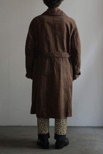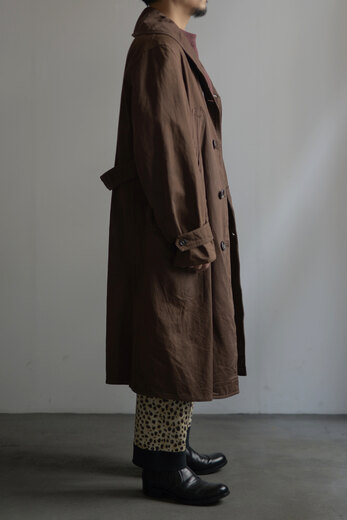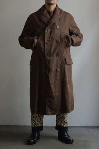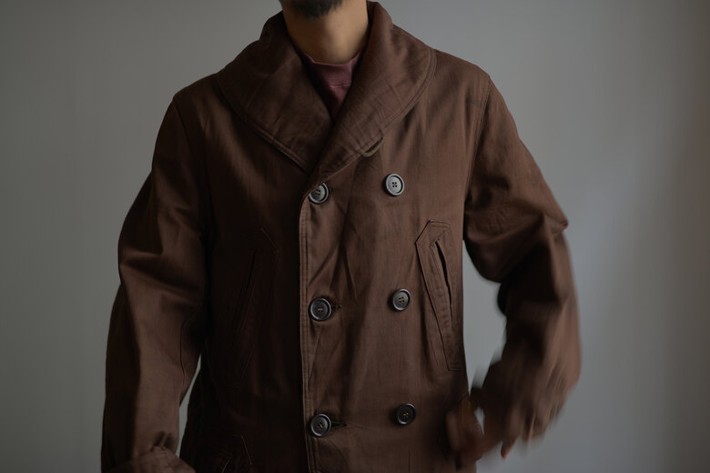 1930-40年代アメリカのマッキーノコートです。大きなショールカラー、ダブルブレスト、当時寒冷地でのアウトドア、スポーツ向けのウェアとして製作された1着。マッキーノコートはミドル丈の物が一般的ですが珍しいロング丈。すっきりとしたシルエットでアメリカというよりはイギリスの雰囲気が残っている気がします。ムートンライナーが付いていた事を考えるとかなり細身の人向けに作られたのかもしれません。現代の定番的なチョコレートカラーは日々のコーディネートに取り入れ易く、自然と馴染んでくれると思います。