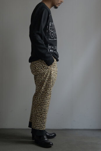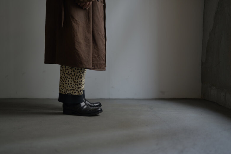 ちゃんとしてるけど気を使わなくて良い。家にいる時にも近所に出かける時も飲みに行く時だって穿いていける。汚れてしまっても洗濯機で普通に洗える。伸縮性があるので動き易くスウェットの様に膝が出ることも無い。毛並みが見える超高解像度の豹柄は難解そうに見えてもとにかく穿いてしまえば何とかなるもので、どうしても提案したくなった。ウルトラスエード、この素材の虜になって何年経つだろうか。コート、ジャケット、ベスト、パンツ、ショーツ、Tシャツ。たくさん所有していて、どれもまだまだ現役で衰える感じがしない。何年前の物でも着ると気分が良い。それはCLASSだから、という部分が大きいのかもしれない。何故なら堀切さんのデザインはいつも驚きやワクワクを与えてくれるからだ。CLASSを着る。そしてクルーキットやLILY1ST、PROJECTbyH.を着る。自分にしか出来ない組み合わせが本当に楽しい。だから無いと困るのがCLASSなのだ。