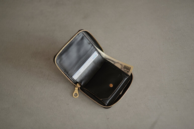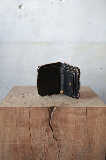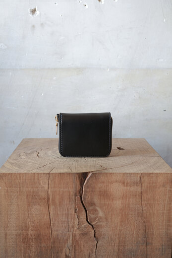 折財布を出来るだけ小さく、と考えられたモデルのラウンドZIP折財布S。手に収まるほどのサイズ感で、カード入れは3箇所で6枚は無理なく入る。小銭入れは大きく開き、全体が見え出し入れし易く、お札は片側が開く仕様なので、引っ掛からずストレスがない。本来なら小さくすればする程、実用面を犠牲にする部分が出てくるけれど、そこをカバー出来るのがTochcaのデザイン。使っている革はホーウィン社のクロムエクセル。茶芯(地が茶色)なので少しずつ茶色が出てくる革。油分たっぷり、モチモチで馴染みが良く、使い込めば深みが増し艶がどんどん増していく。そんな変化を日々感じられるのも楽しみの一つ。修理もずっとお受け出来ますので、長くお使い頂けます。