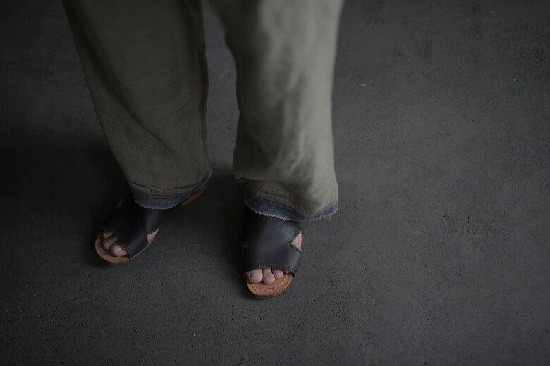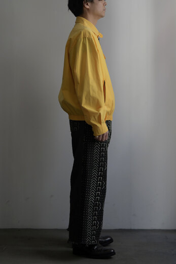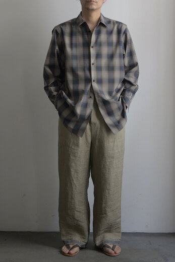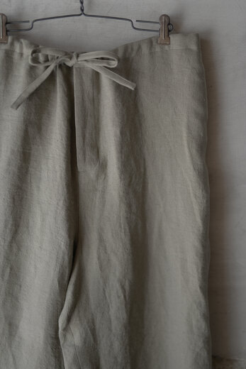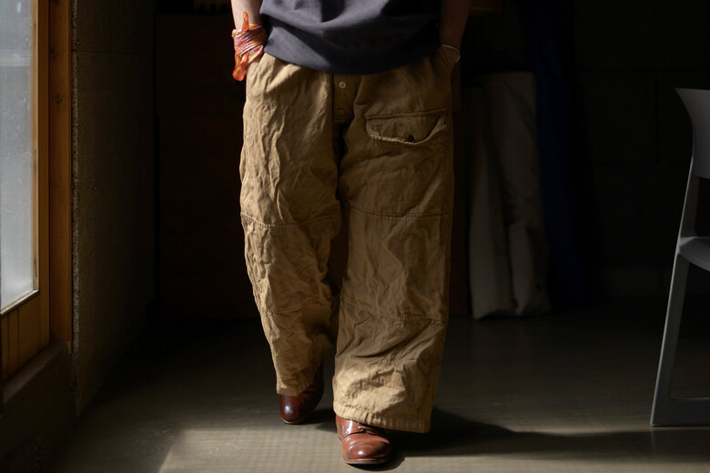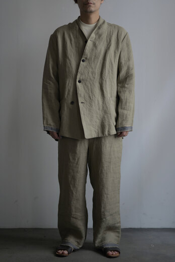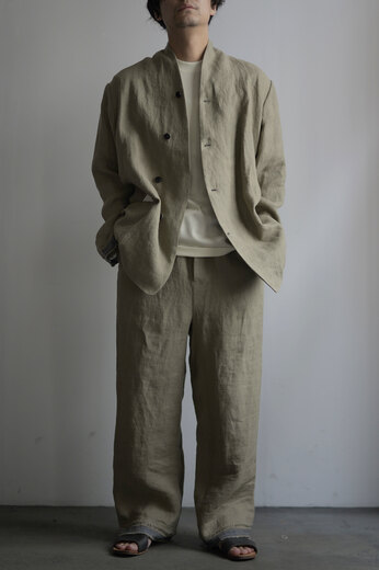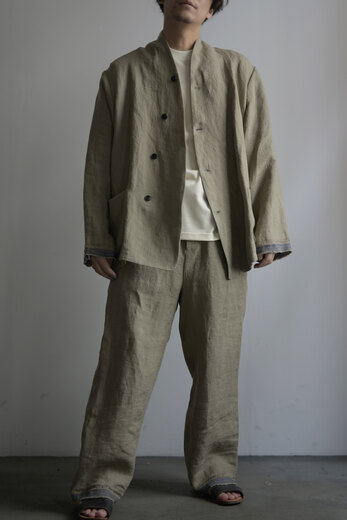SANPO JACKETと同素材のリラックスしたイージーパンツ。縦横太番手のリネンの糸を古いションヘル織機でゆっくりと織り上げたツイル。生地になった後、ニドム加工をする事で洗い晒しの風合いを出した味わいのある素材。古いヴィンテージのコートやジャケットで見られる、あのプルプルとしたリネン。そんな印象を受けた。ジャケットと同様に生地の端っこの耳糸はカットする部分だがストライプ柄という事と全て使い切る事で生地に無駄が出ない様にデザインとして使っているそうだ。涼しくて肌触りも良くて快適。ジャケットと組み合わせてもいやらしさがなく、程良い抜けのある素晴らしいパンツだ。”散歩”についてはジャケットのページをご覧ください。