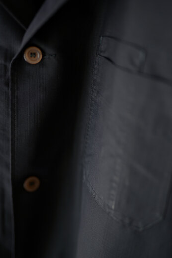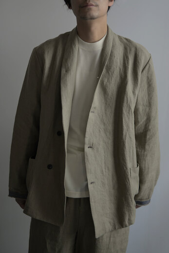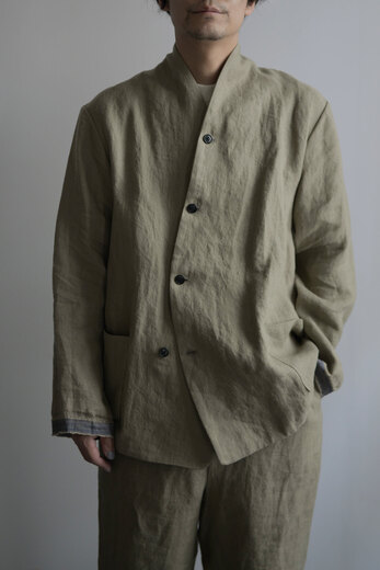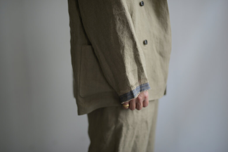 このジャケットは”Sanpo jacket”と名付けられている。散歩というのが私にとっては非日常的でもあり、目的がなくブラブラと歩くことを最近していない。長らくしていない散歩を想像してみた。できれば鞄は持ちたくない。携帯と小銭入れくらいでポケットには手を入れる余裕を。そして羽織っていない位の軽さが欲しい。でも生地はぺらぺらとしていなくて程よく厚みもあり、繊細すぎず自然にも都会でも合うのが理想。ハイキングではないし、運動の為に散歩をする人もいるだろうけど、私たちの散歩理想像は頭をからっぽにしてぶらりぶらりと歩く事だから、足元はサンダルなんかを合わせても家着っぽさが出過ぎないのが良い。そんな大人な感じが理想。本をポケットに入れて出かけたい。結果本を読むという目的を持ってしまうが、時間をそんな贅沢に使えるようになりたい・・と、この”Sanpo jacket”を見て思いを馳せてみた。散歩理想像を書いていると生地の事が書ききれなくなってので、同じ生地で作られたパンツのページをご覧ください。