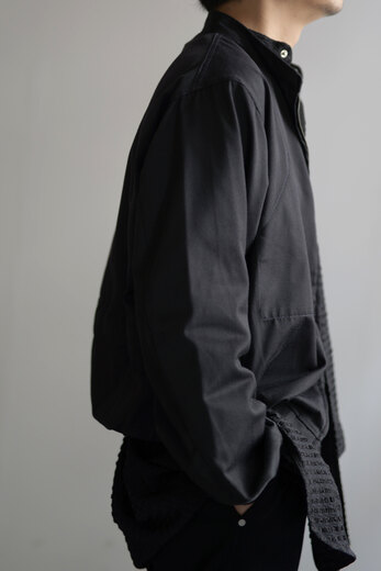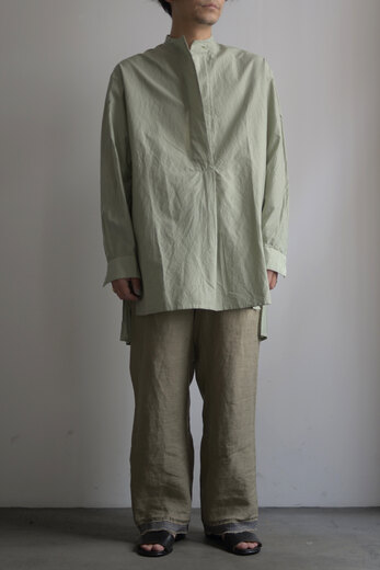 この襟の大きさを見ると着丈が長くなりそうなのに短い、ボタンを見ていると最後までいきそうなのにいかない、その絶妙で潔いバランスが良い洋服だなと感じたプルオーバー。フリースジャージーを裏使いしたLOOP TWILL。柔らかな風合いが心地良い素材。中に着る洋服やボタンの留める数によって変化を楽しめる。