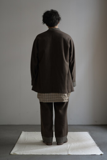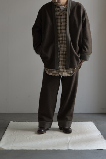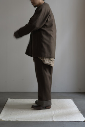 ヤク100%。足を通した瞬間から体が喜んでいる様に感じる。柔らかく、フワッとしていて暖かい。古いションヘル織機でゆっくりと織り上げ、染色も天然で行い昔ながらの製法を再現し時間を掛けて作り上げたパンツ。家でも、外でもどこでも穿いて行きたくなる。ウエストの紐と裾には0番手の太く味わいのあるカディコットンが使われている。このヤクは瀬谷さんが実際に着て洗ってを繰り返した物を拝見し、まるでフリースの様に、あまりにも気持ち良くなっているのを見てお店に並べる事を決めた素材。長く使えば使う程、その良さを実感出来るパンツだ。