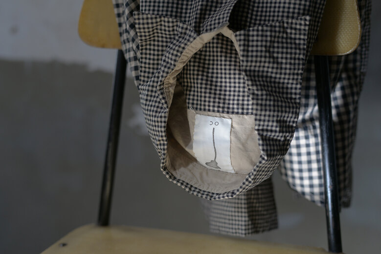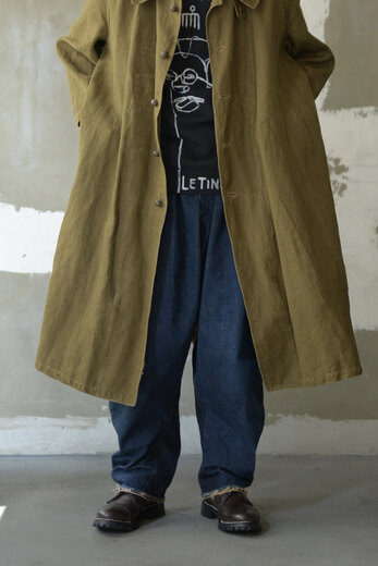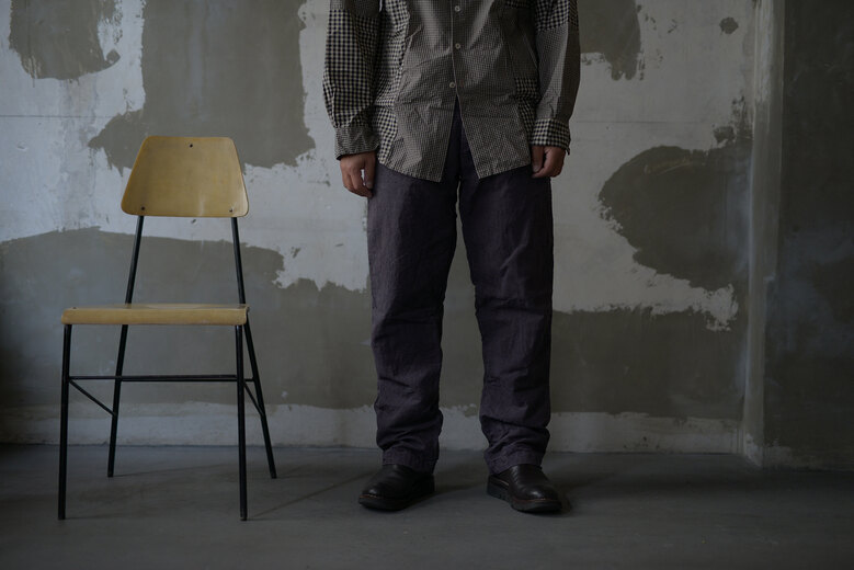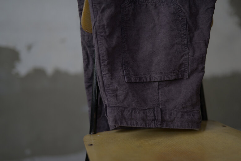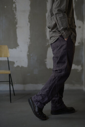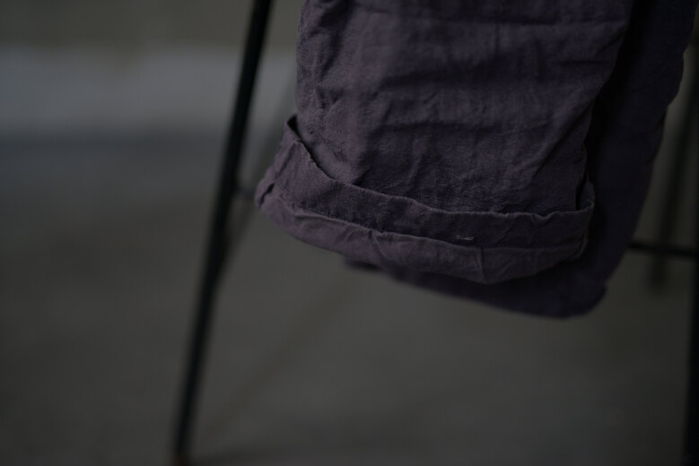 新しくパンツをデザインしたから見て欲しいとオリバー氏から連絡があり、フランスから送ってもらい早速穿いてみると履き心地の良さ、動き易さ、シルエットの良さにビックリ。すぐにシャツと一緒にオーダーする事を決めた。程よくゆとりがあり、少しテーパードしている片ポケットのワークパンツデザイン。素肌に触れる部分がとても心地良かったので裏返してみるとコットンの総裏だった。今から50年〜70年前のフレンチコットンリネンをボタニカルダイした生地は唯一無二の存在感がある。フロントはボタンフライ、ボタンはマザーオブパール、ボタンホールはシルク糸を使い手縫いにて行われている。『もう何だかわからないけど、とんでもないですね。』ご購入されたお客様のそんな言葉が1番正しいかもしれないと思った。