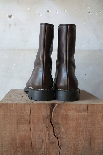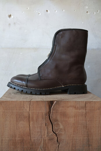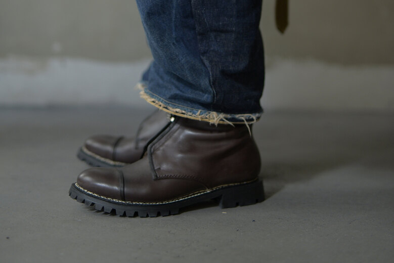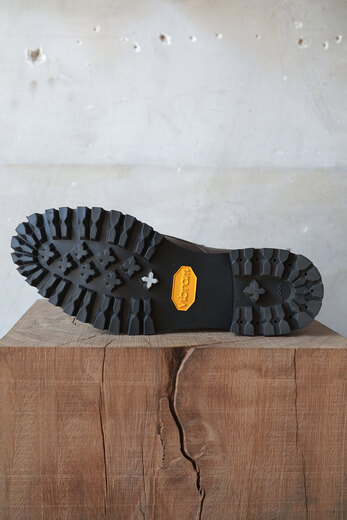 暖かいコートを着てデニムを穿き、ウールソックスにブーツ。冬になるとブーツが履きたくなる。しかし、レースアップは着脱に少し時間がかかる。その点ジップのブーツはスリッポンの様な手軽さもあり使い易い。今回の新作はセンタージップ。引き手は『おもちゃ感を出したかった』とナットでのお手製。上質な革とのアンバランスさがとても気に入った。レザーはオイルたっぷりなナッパレザー。しっかりと育っていきそうな味わいのある質感、そして柔らかさもあり初めから足馴染みが良く、優しく包まる履き心地。登山靴でよく見られるノルウェイジャン製法で水の侵入を防ぎ、ソールにはヴィブラム社のファイヤー&アイスで濡れた地面でも安心だ。単品で見ると無骨なワークブーツの様な趣だが、足を通すとスマートな印象に変わる。見た目と履き心地のギャップがsonomituらしい靴だと思う。