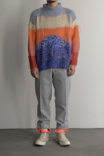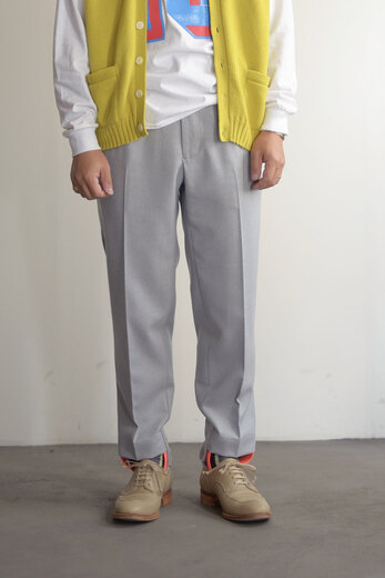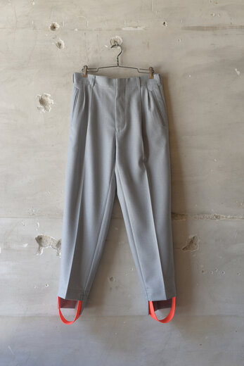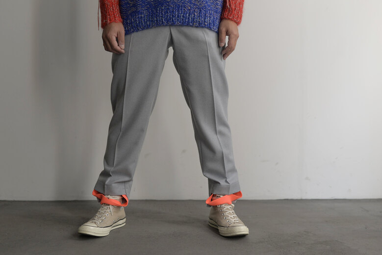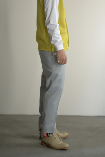 表情が美しいウールフランネル、一見綺麗なスラックスだが裾のゴムが楽しい。そのまま靴に入れて、前に出したり後ろに出したり。靴によって様々なバランスが楽しめる。昔のジャージを思い出し、少し懐かしい感じもする。
