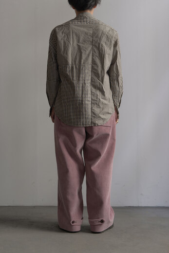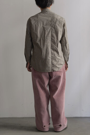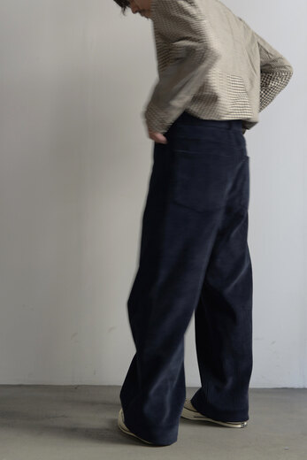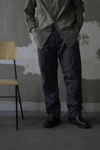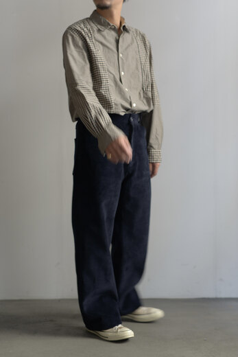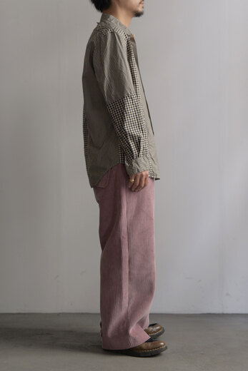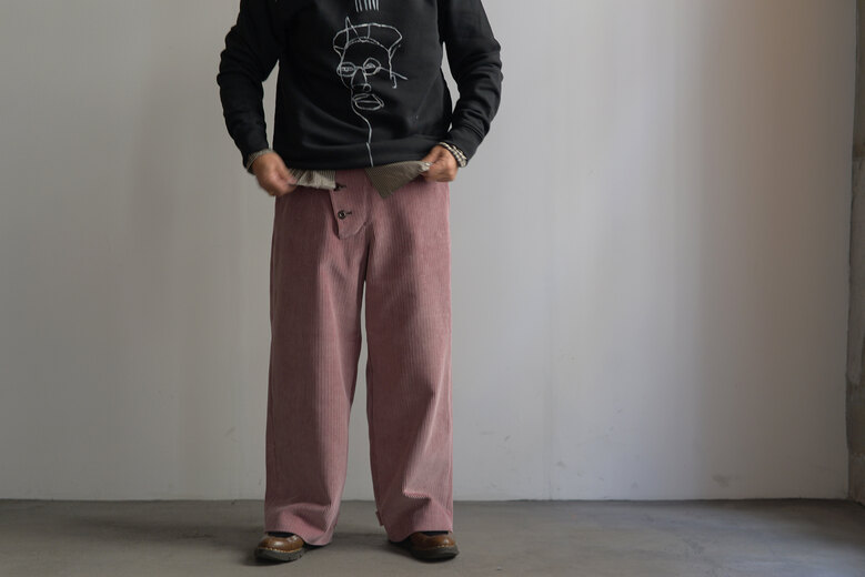 古い時代のワークパンツを思わせるワイドでストンと落ちるシルエット、そしてずっしりとした重みのある太畝、冬はその重みが心地が良い。穿き込み甲斐があり寒い冬だからこそ楽しめるのがコーデュロイ。少しくすんだピンクはとても合わせ易く、違和感なく馴染んでくれる良い色だ。フロントの斜めにズレたデザインとおもちゃのようなボタン、素材とのコントラストが面白い。