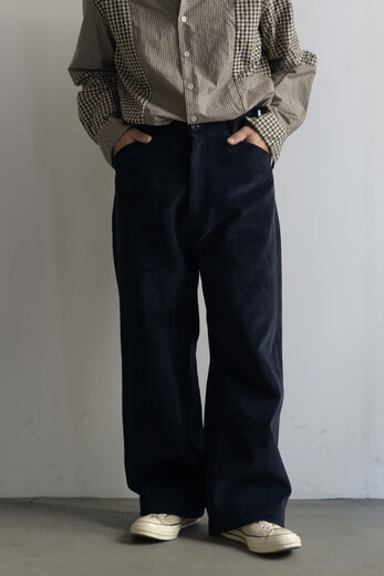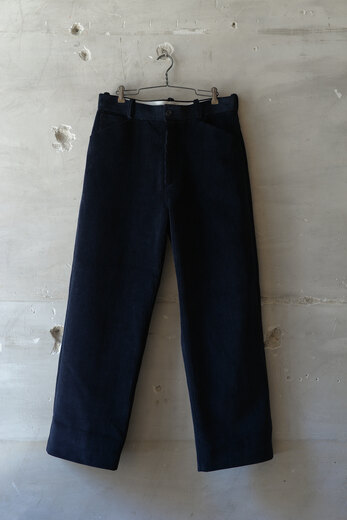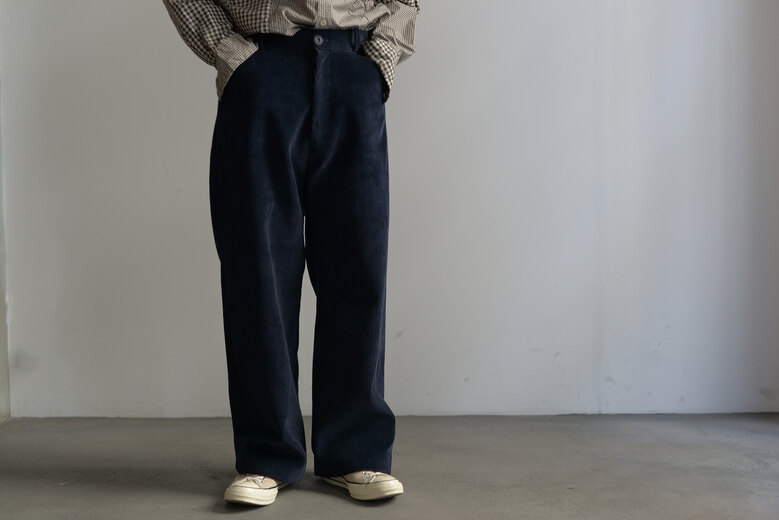 無駄のないデザインと足がすらっと見えるパターン。その使い易さからつい手に取ってしまうのが5PKT TROUSERS。古い時代のワークパンツを思わせるずっしりとした重みのある太畝、冬はその重みが心地が良い。使い古した後の経年変化も楽しめる素材。深みのあるネイビーは光のあたり具合で青みがはっきりと感じられ、とても奥行きのある綺麗な色である。スニーカーや革底の革靴ですっきりと、ブーツで迫力を出しても良さそうだ。
