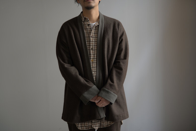 カシミアに包まれる心地よさを知ってしまうと、寒くなる事が楽しみになっている。体の芯からジワッと温まるあの感覚、素肌の上から着たくなる程の柔らかさ。クセになってしまう素材である。今までローゲージやミドルくらいの物をご提案してきたが、今年は少し薄手で体にフィットし、ジャケットやコートが着やすい物を探していた。それもカーディガンだと尚更良し。そして見つけたのがsuzusanのサイドシームのないカシミアカーディガン。内モンゴル産の上質なカシミア。偶然が重なり、毛玉の出にくい生地になったそう。染めはマダラ絞り。写真ではマスタードイエローが割とハッキリ写っているが、実際はもう少しブラウンと馴染んでおり、とても上品な印象だ。どうしても染めに目がいくが、素材や作りも本当に素晴らしい。