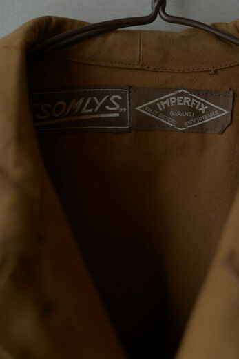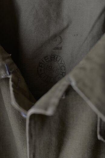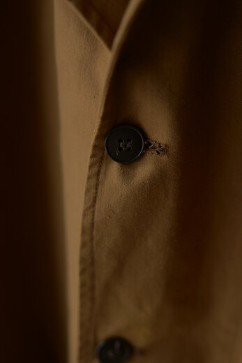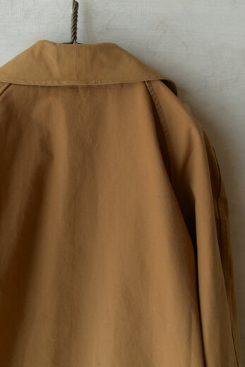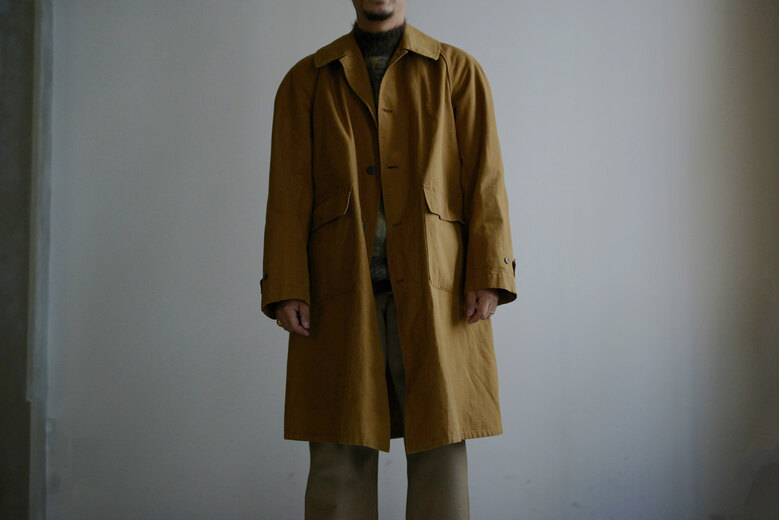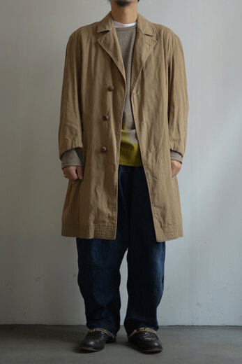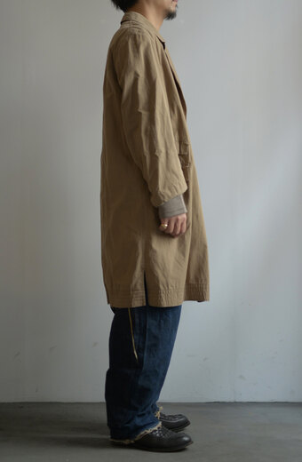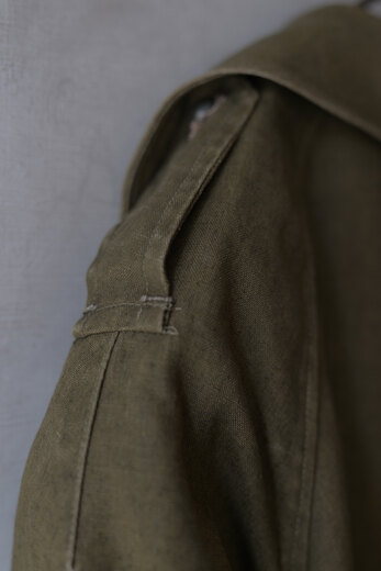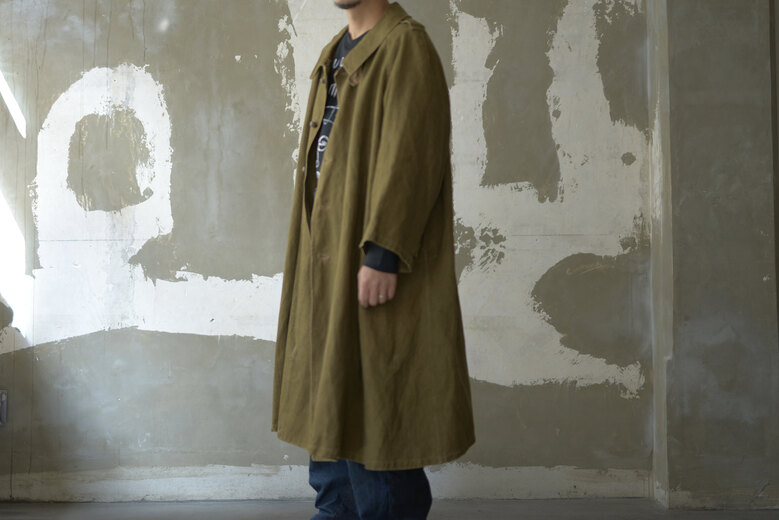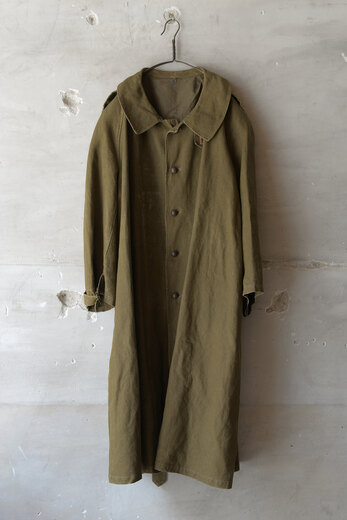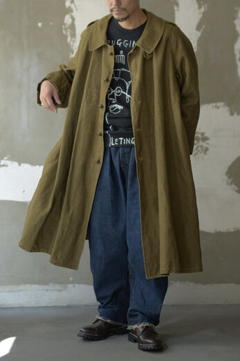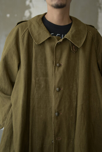 生地やデザイン、ボタンや襟の形。その一つどれかが欠けてしまうとこのコートでは無くなってしまう。それ程に完成度が高く、現代でも名品と言われているフランス軍のモーターサイクルコート。あまり考えて着るものではなくとりあえず羽織るだけで良い、そんな空気を纏っている。まだ硬さの残る上質なリネンダックのずっしりとした重みが身体に乗ると心地良く感じ、身体に馴染んだ頃にはもっと素晴らしい表情になっていると確信できるコートである。年齢を重ねてもさりげなく羽織っていられたらどんなに格好良いか、と想像している。
