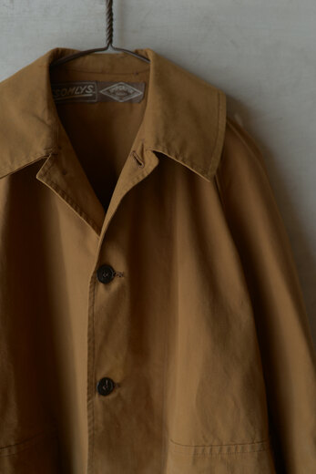 ハンティング用に仕立てられたコート。アームの可動域が広く、動かし易い作りになっている。取り外し可能なアンブレラヨーク付き。どうして古い年代のダック地はこうも魅力的なのだろうか。決して身体に優しくはない高密過ぎる硬く分厚い生地。それを敬遠する事もなく、着てみたいと思わせてくれる。自身が着る事によって硬い生地を柔らかくしていく過程や色がフェードしていく過程、何年先かわからない未来を今想像して楽しんでいられるからだと思う。でもそれは着る事によって必ずやってくる未来でもあり、そんな洋服はいつまでも大切に着ていたいし、出会えたら良いですよね。