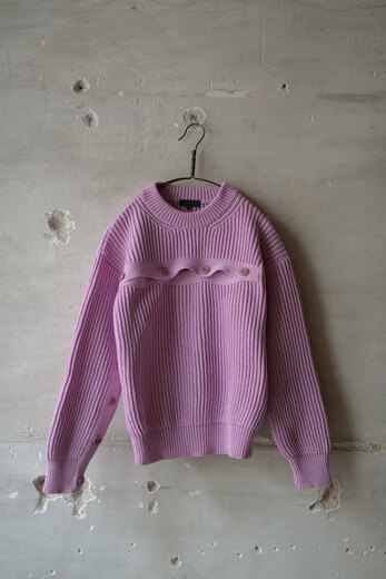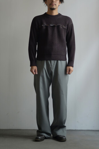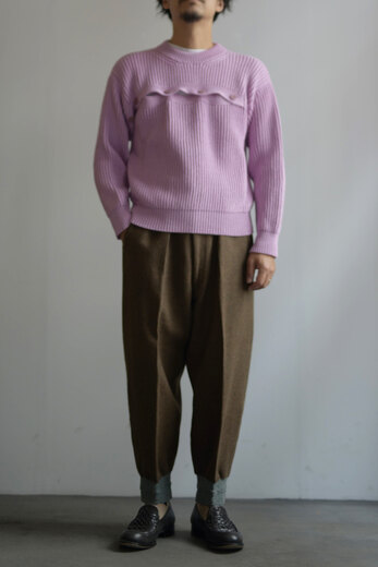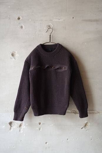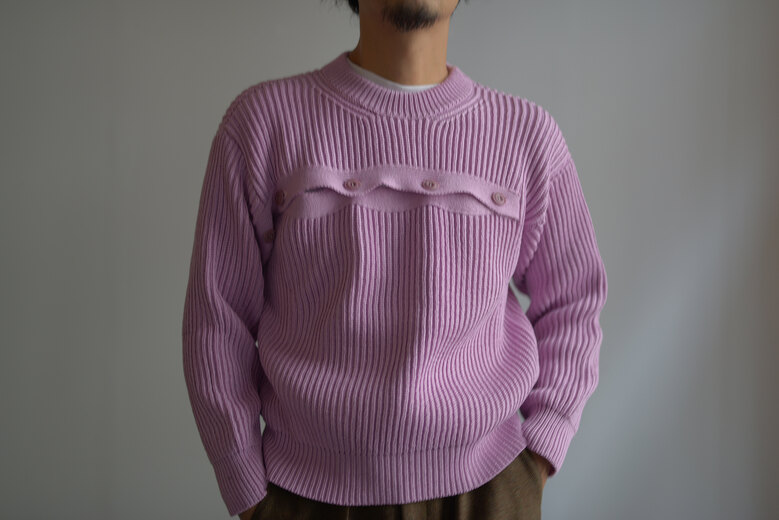 私達はニットが好きだ。特に秋冬はお店の中がアウターよりもニットだらけになる事が多い。素材やデザイン、編み方など特徴が沢山で見ていても面白く、実際に着るとじんわりと暖かく冬を実感できるからだ。オマールのニットはコットン。スウェットやロンTに近い感覚で着れる。畔編みのシンプルなクルーネックに胸から右腕に掛けて伸びる前立ての様な、違和感が面白いデザイン。これはカーディガンをずらした様なイメージなのかな?軍物のセーターの様にも見える。見る視点や感じ方、人それぞれの捉え方で着て楽しんで欲しいと思ったIMMERSION KNIT。