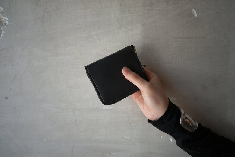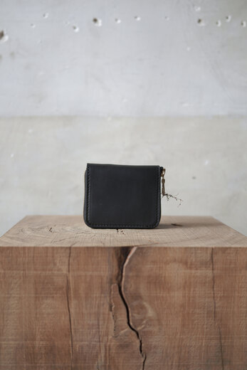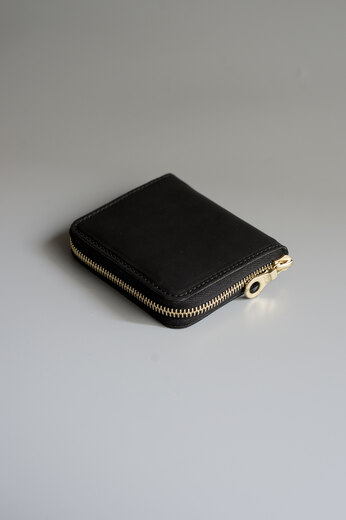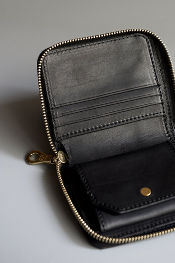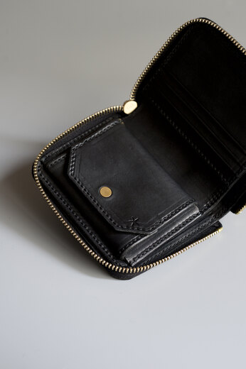 折財布を出来るだけ小さく、と考えられたモデルのラウンドZIP折財布S。手に収まるほどのサイズ感で、カード入れは3箇所で6枚は無理なく入る。小銭入れは大きく開き、全体が見え出し入れし易く、お札は片側が開く仕様なので、引っ掛からずストレスがない。本来なら小さくすればする程、実用面を犠牲にする部分が出てくるけれど、そこをカバー出来るのがTochcaのデザイン。使っている革はGUIDI社のカーフ。油分たっぷり、モチモチで馴染みが良く、使い込めば深みが増し艶がどんどん増していく、そんな変化を日々感じられるのも楽しみの一つ。修理もずっとお受け出来ますので、長くお使い頂けます。