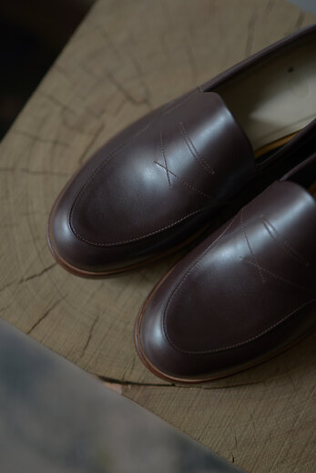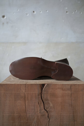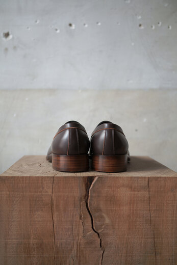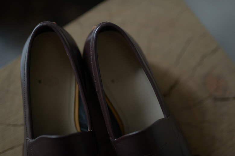 足元を彩る革靴。シンプルなプレーントゥやブーツ、スリッポンなど種類が沢山あり、さらに革の種類や製法など洋服よりも選べる範囲が広い。履く程に自分の足の形に合ってくるし、革の経年変化を楽しむ事ができる。しかし足の形やサイズも含めると選ぶのが少々難しい。特にローファーは歩いていて踵が抜けやすい。日本人は踵が小さいから尚更だ。経験上、日本人の作る革靴はとても合いやすい。PETROSOLAUMのローファーは踵が小さめに作られている。フィット感も良く、踵が抜ける感じがしない。使われているoil solf kipは柔らかく足を優しく包み履き心地が良い。ビスポークの技術を取り入れた03の木型は視覚的にも美しく、足元を見る度に顔が綻ぶ。細くもなく、丸過ぎず、ステッチだけでコインローファーを表現したデザインもユニークだ。そしてローファーといえば、という雰囲気も感じない。だからrenomaとも馴染みが良いのかもしれないと思った。