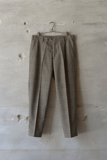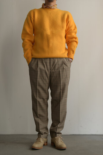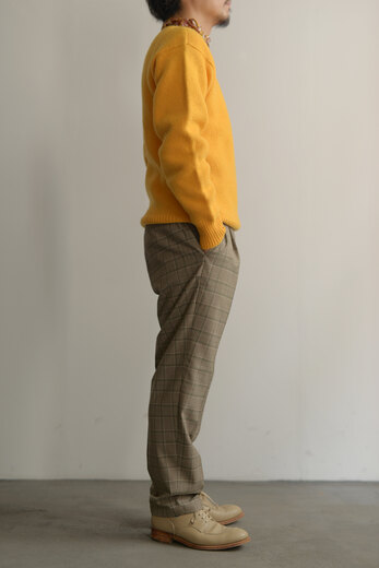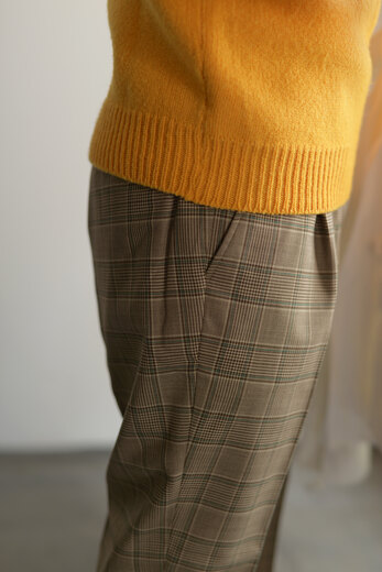 アンのパンツの中でも少し細身のデザインのONE TUCK TROUSERS。今回の素材は強撚ウールとポリエステルを組み合わせた畝のように見えるカルゼ組織に織り上げたツイルで、ドライな質感と程良いドレープの効いた素材。ベージュにグリーンのラインが入ったブリティッシュなチェック柄は冬のニットやコートとも相性が良い。柄物は案外合わせ易いし、ちょっと物足りないなと思う日の気分を変えてくれる。持っているととても便利なパンツだ。