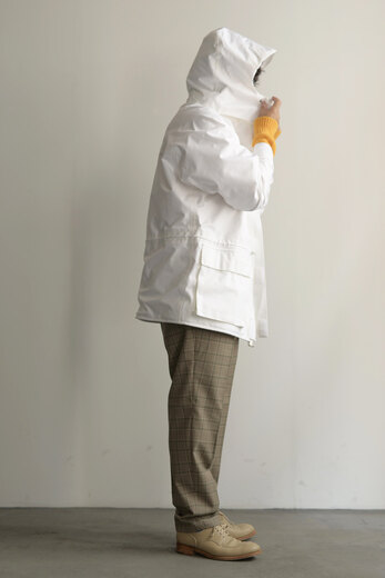今まで素材違いで何本穿いてきただろうか。ブランドが始まって以来、自分の中でもずっと定番であり続けているプルパンツ。素材が変わると印象が変わるのも面白い。例えばコットンならチノパンにしか見えないし、クラシックな素材だとスラックスに見える。同じデザインでも違う気分を味わえる。そして1番の特徴はベルトレス、名前の通りアジャスターを前に引っ張るだけでウエストを締める事ができ、緩める時は金具を後ろに引くだけ。イージーパンツのような快適さも兼ね備えたパンツなのだ。今回の素材は強撚ウールとポリエステルを組み合わせた畝のように見えるカルゼ組織に織り上げたツイルで、ドライな質感と程良いドレープの効いた素材。クラシックに見える素材は冬のニットと相性が良い。